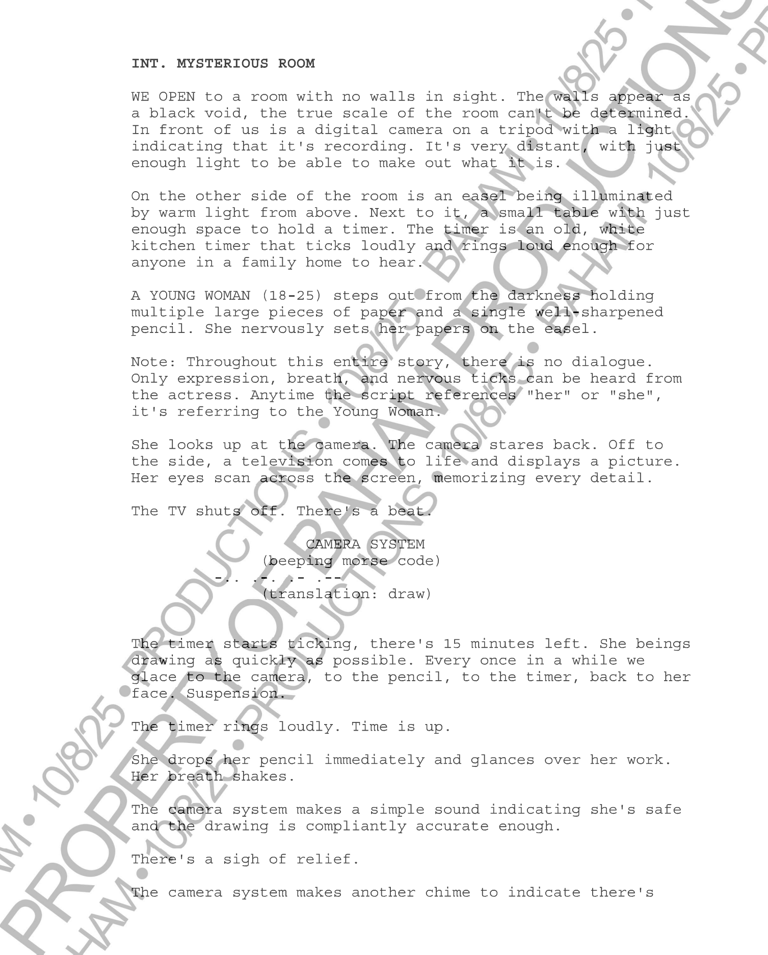 Logline: Where artistic practice and self discipline collide, someone must learn to draw under a strict time constraint.